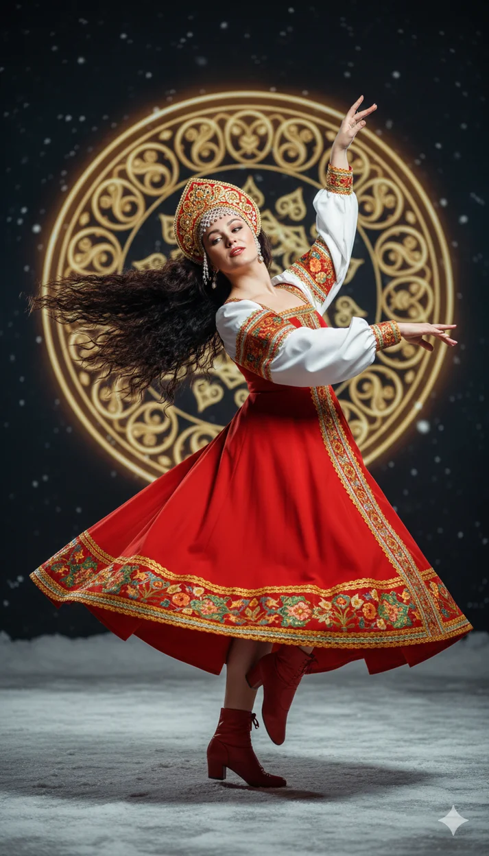 Женщина в красном сарафане на деревянных санях с горки на снегу