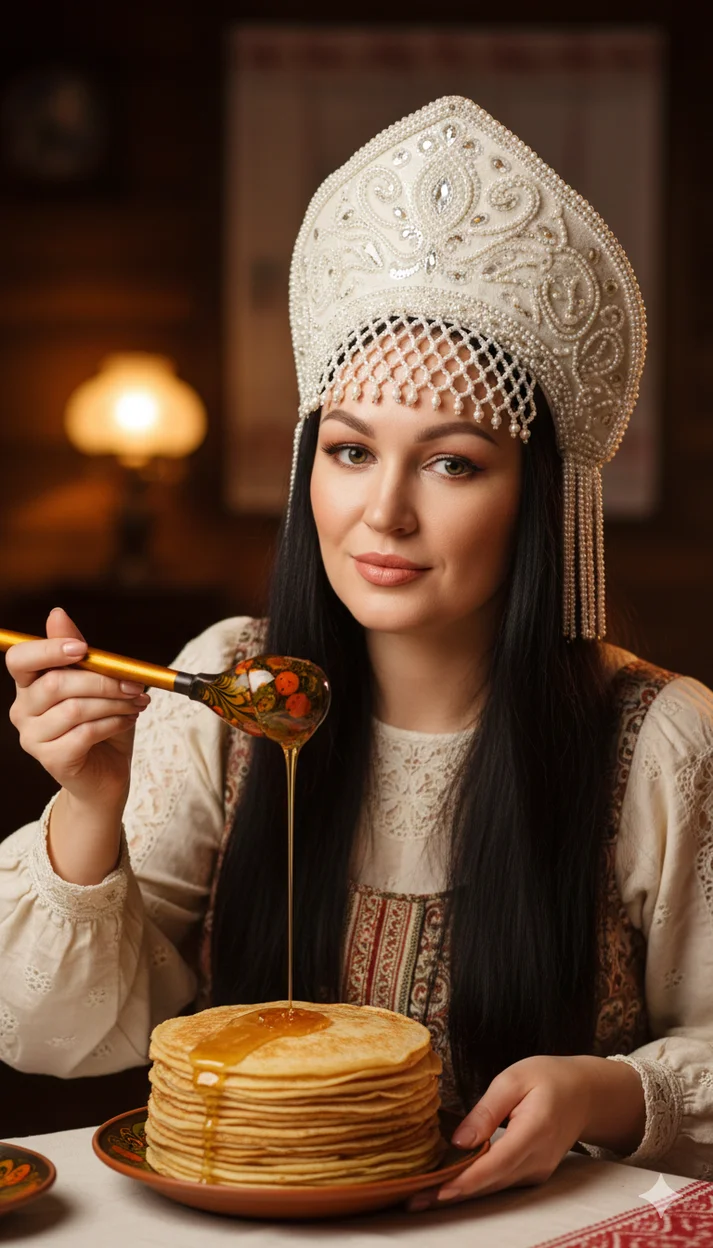 Девушка в традиционном кокошнике льёт мёд на стопку блинов