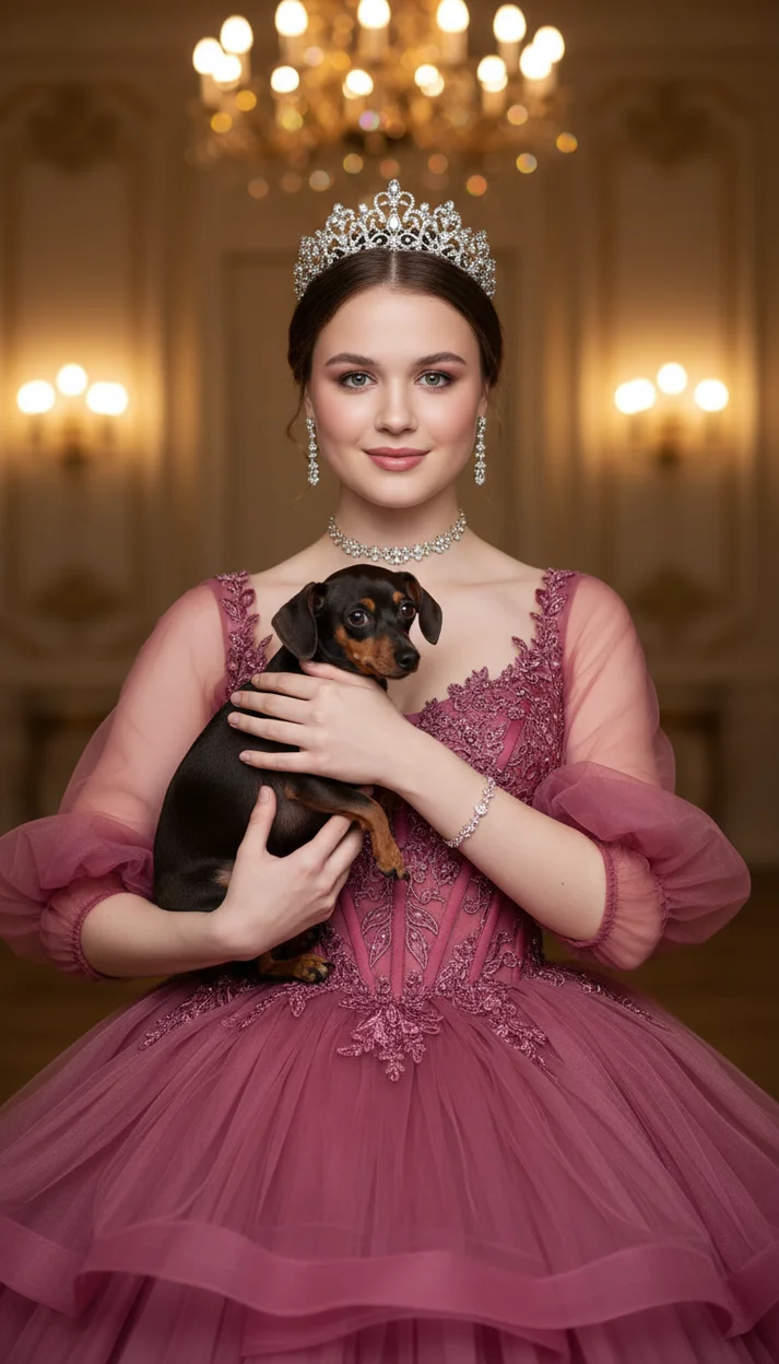Этот стиль превращает ваше фото в кадр из королевской хроники. В центре композиции — вы в великолепном розовом платье с многослойной юбкой из тюля и изысканной тиарой. Мягкий золотистый свет классического интерьера подчеркивает благородство образа, а маленькая собачка в руках добавляет кадру теплоты и жизни.