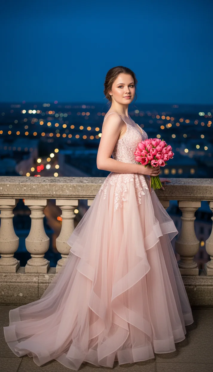 Этот стиль переносит вас на классический балкон с видом на сияющий мегаполис. Вечернее платье нежно-розового цвета со шлейфом и букет живых цветов создают атмосферу романтического свидания или торжественного вечера. Сильное боке ночных огней добавляет кадру глубины и кинематографичности.