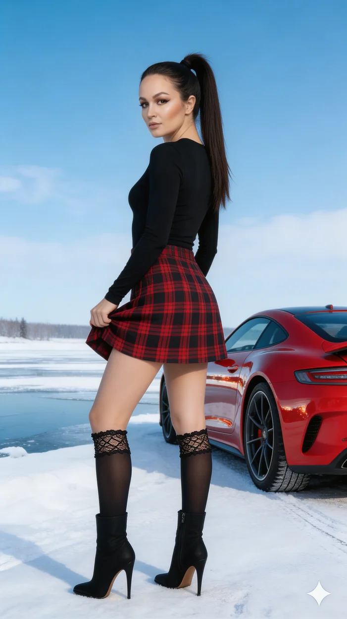 Этот стиль идеально передает атмосферу свежести и смелости. Нейросеть генерирует реалистичный кадр, где холодные зимние оттенки сочетаются с яркими акцентами образа. Заснеженная поверхность и голубое небо создают чистый фон, на котором особенно выразительно смотрятся детали одежды и глянцевый блеск спортивного автомобиля.