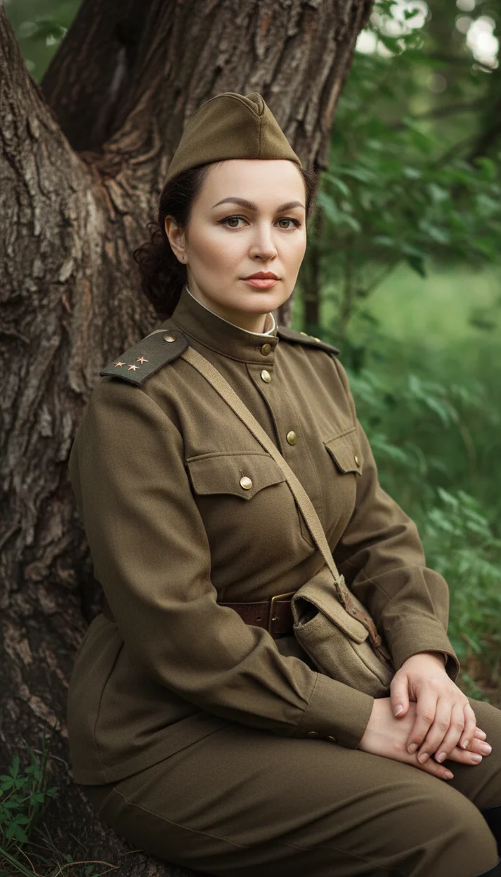 Этот стиль генерации предлагает спокойный и эстетичный образ женщины-военнослужащей на отдыхе. Сидя у дерева в окружении листвы, героиня смотрит в кадр, создавая доверительную атмосферу. Нейронка детально воспроизводит фактуру гимнастерки, кожаного ремня и сумки, а мягкий винтажный свет придает снимку теплоту и художественность.
