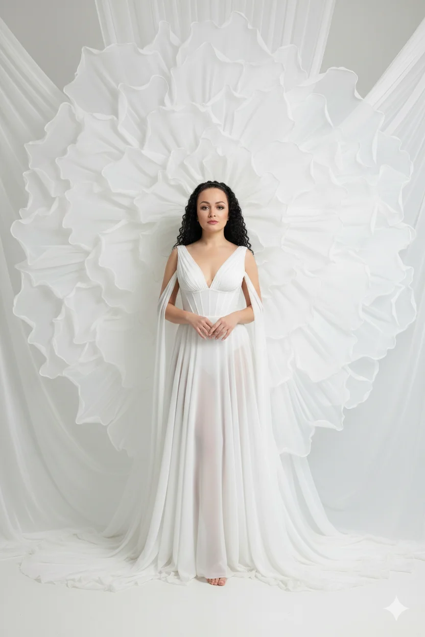Этот пресет создает эстетику чистоты, роскоши и невесомости. Главный акцент сделан на сочетании утонченного силуэта и монументальной декорации. Вы предстанете в многослойном платье из полупрозрачного белого шифона с корсетным лифом, подчеркивающим фигуру. За спиной разворачивается гигантская инсталляция из ткани, напоминающая лепестки экзотического цветка или облако, что придает кадру невероятный объем и динамику.